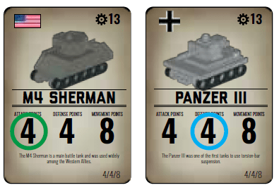 The active player is shooting with an M4 SHERMAN at a PANZER III. On the VICTORY TABLE we see the intersection of the M4 Sherman’s AP and the Panzer III’s DP. The active player must roll an 8 OR HIGHER on 2D6 in order to destroy the Panzer III.
