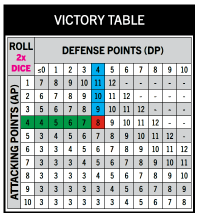 The Victory Table is used to find the minimum dice roll needed to destroy the target unit.