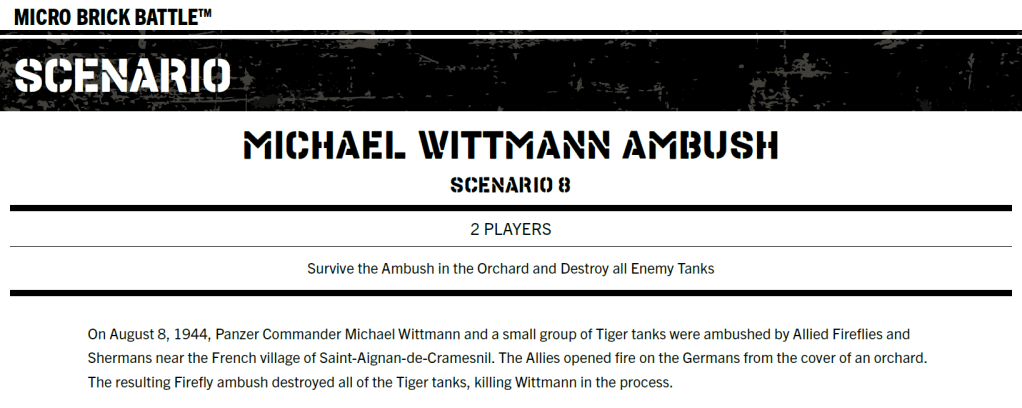 Scenario 08 – Michael Wittman Ambush Click the button below to download the PDF: z024-scenario-8Download . This scenario was first released in Brickmania Magazine #24 Share this: Click to share on X (Opens in new window) X Click to share on Facebook (Opens in new window) Facebook Like Loading...